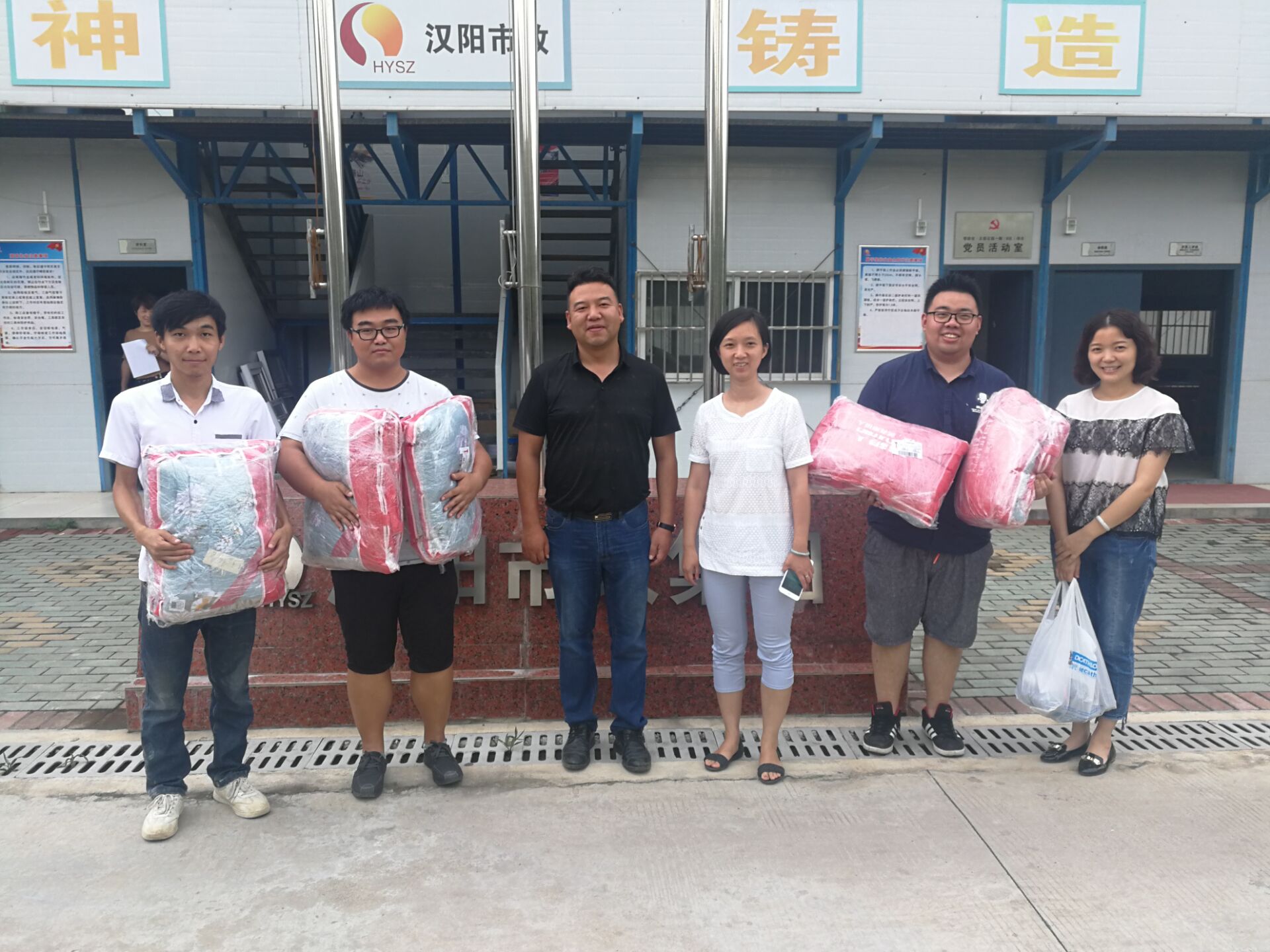 7月12日,博宏建設支部副書記郭一清、工會主席李俊等來到黃石正信花園項目,為職工送去關心與慰問,并根據項目一線施工需求,為每位職工準備了防曬服一套及空調被。