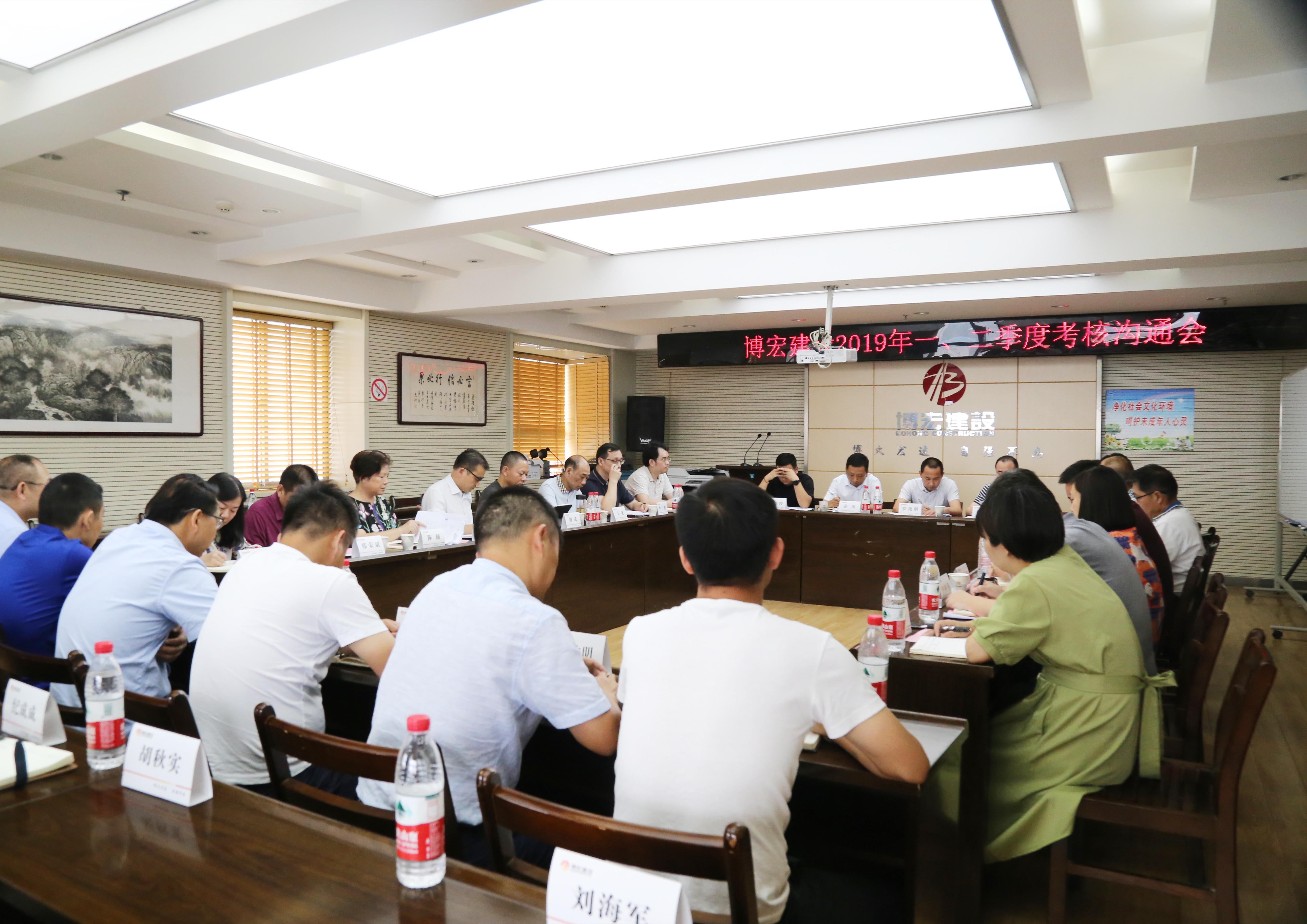 ?????????? 7月9日下午2:30,公司2019年一、二季度考核溝通會順利召開,會議就博宏建設上半年考核工作目標完成情況進行了分析和交流,并就下半年工作思路進行進一步明確。漢陽市政集團公司黨委班子、各科室負責人、博宏建設支部班子、各部門負責人、項目經理及技術負責人共計40余人參加了此次會議。