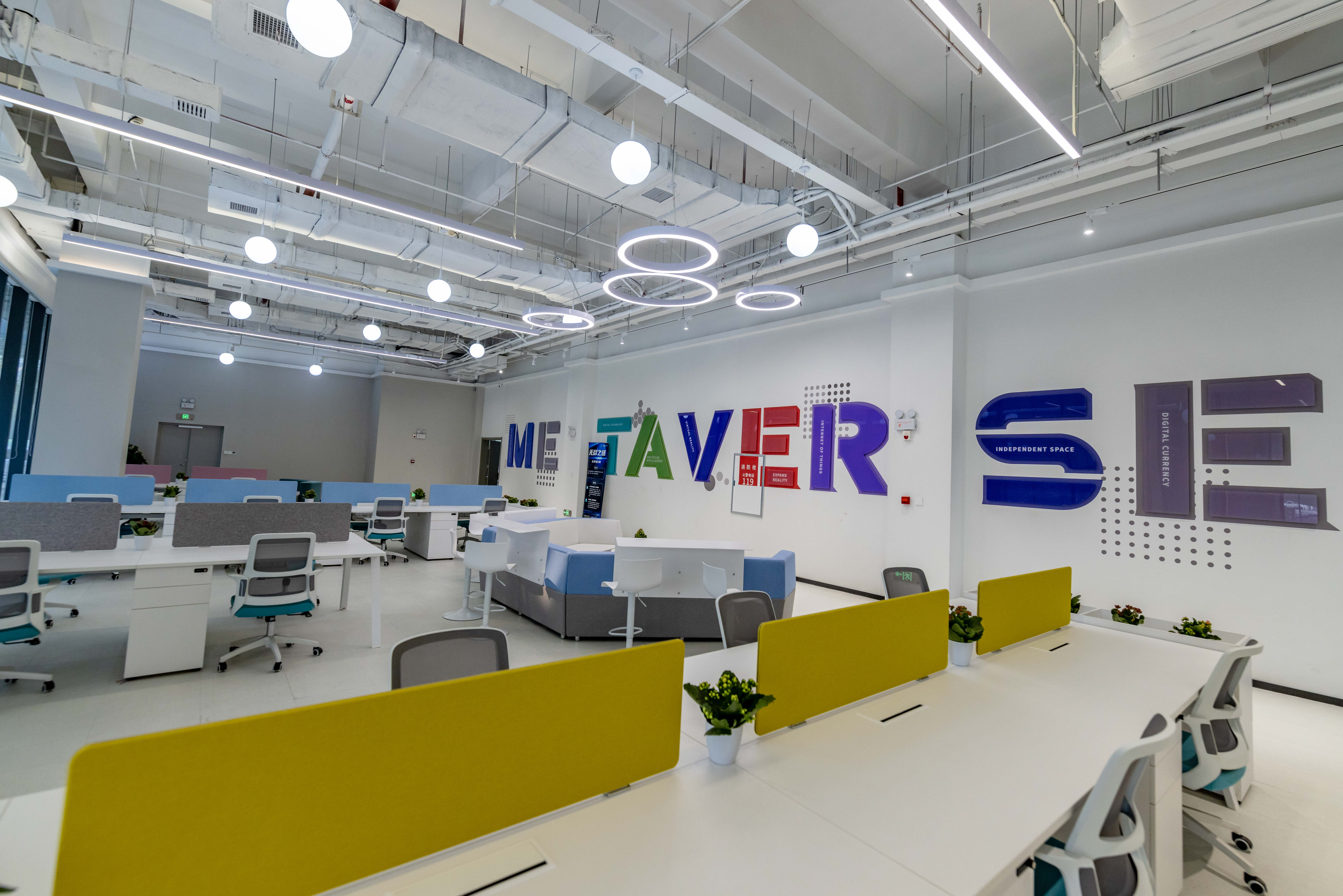 利用不同顏色不同紋理的木紋磚將辦公區(qū)域與休閑區(qū)域進行分割。這樣各功能性分區(qū)都有固定的主要功能,也可安置各自的特色家具。整個空間采用了親和、天然性的裝飾材料,顏色的碰撞、元宇宙元素的融合,創(chuàng)造了具有未來感、幸福感的空間氛圍。